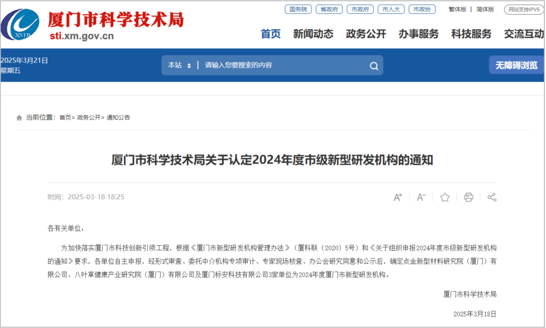 2025年3月18日,厦门市科学技术局正式认定八叶草健康产业研究院(厦门)有限公司为 2024年度厦门市新型研发机构。此次认定依据《厦门市新型研发机构管理办法》(厦科联〔2020〕5号),经形式审查、专项审计、专家现场核查、公示等程序,全市仅3家单位通过认定。